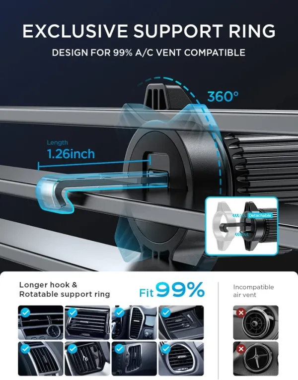- [Latest Design-Never Fall Off]Adopts latest fall-proof locking design which holds your phone securely to the vent. This car phone holder has stable trapezoid-structure clamps with thickened shockproof sponge and rubber, which could hold the phone steadier than others.